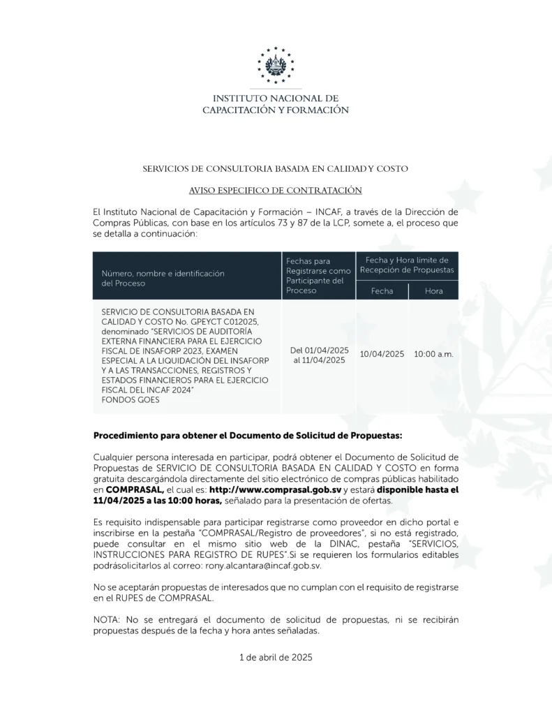 01/04/2025 No. GPEYCT C012025 “ Servicios de auditoría externa financiera para el ejercicio fiscal de INSAFORP 2023, examen especial a la liquidación del INSAFORP y a las transacciones, registros y estados financieros para el ejercicio fiscal del INCAF 2024″
