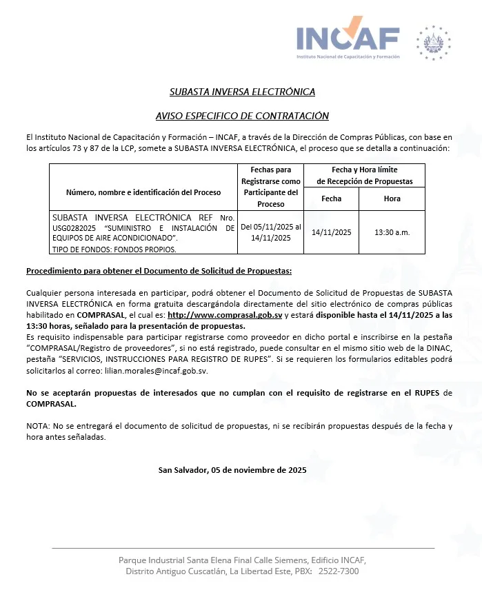 05/11/2025 SUBASTA INVERSA ELECTRÓNICA REF Nro. USG0282025 “SUMINISTRO E INSTALACIÓN DE EQUIPOS DE AIRE ACONDICIONADO”TIPO DE FONDOS: FONDOS PROPIOS.