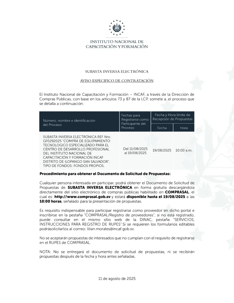 11/08/2025 No. GF0292025 “Compra de equipamiento tecnológico especializado para el Centro de Desarrollo Profesional del Instituto Nacional de Capacitación y Formación INCAF Distrito de Ilopango San Salvador”