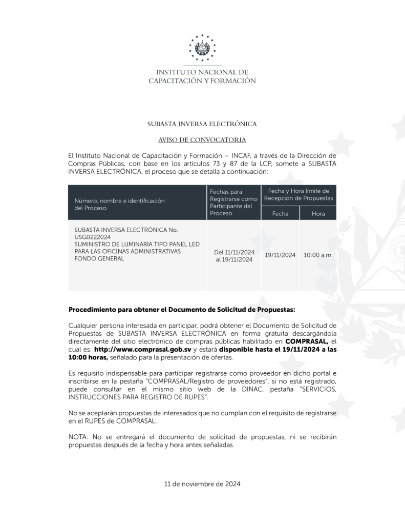 11/11/2024 No. USG0222024 “Suministro de luminaria tipo panel LED para las oficinas administrativas.