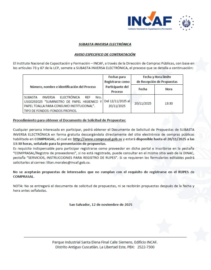 12/11/2025 SUBASTA INVERSA ELECTRÓNICA REF Nro. USG0292025 “SUMINISTRO DE PAPEL HIGIENICO Y PAPEL TOALLA PARA CONSUMO INSTITUCIONAL”. TIPO DE FONDOS: FONDOS PROPIOS.