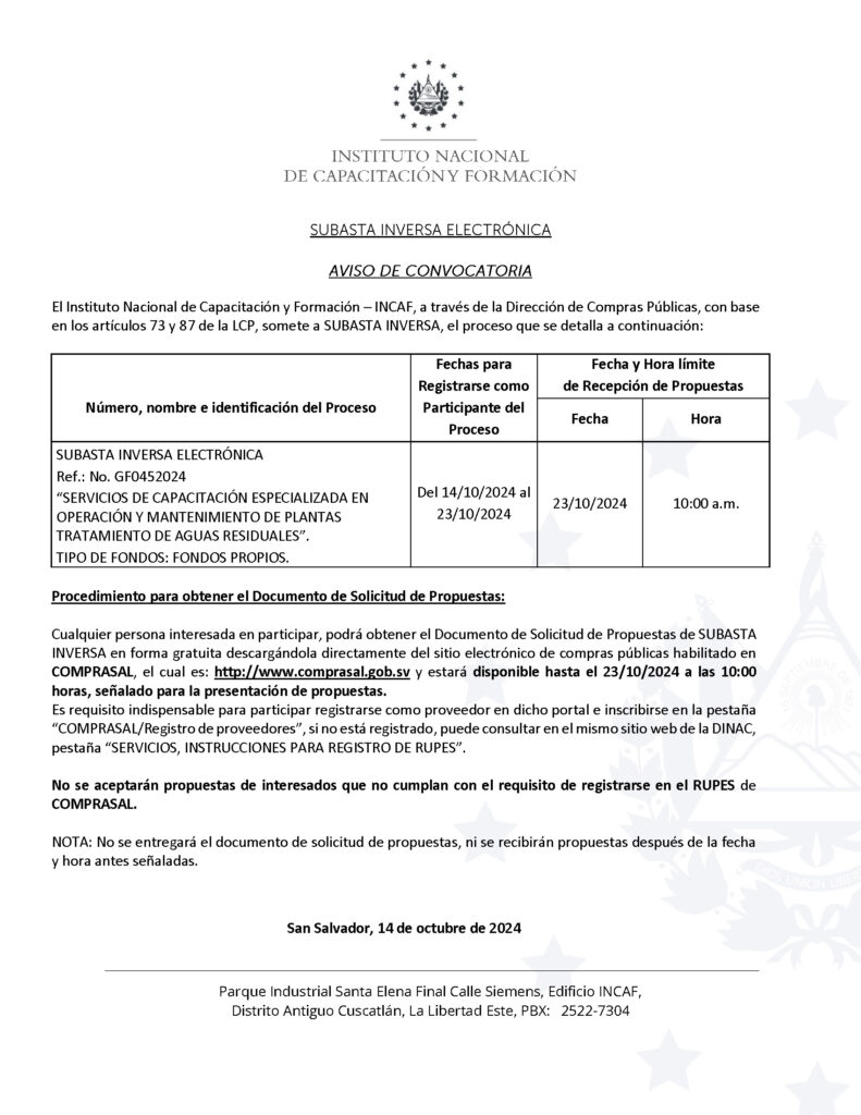 14/10/2024 No. GF0452024 “Servicios de capacitación especializada en operación y mantenimiento de planetas tratamiento de aguas residuales”.