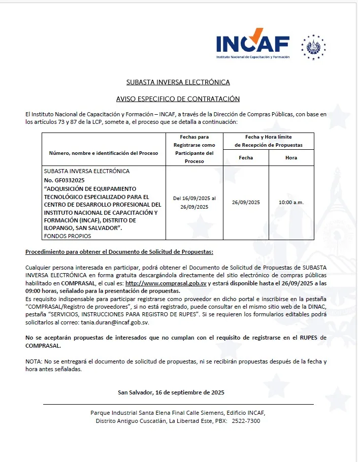 16/09/2025 No. GF0332025 “ADQUISICIÓN DE EQUIPAMIENTO TECNOLÓGICO ESPECIALIZADO PARA EL CENTRO DE DESARROLLO PROFESIONAL DEL INSTITUTO NACIONAL DE CAPACITACIÓN Y FORMACIÓN (INCAF), DISTRITO DE ILOPANGO, SAN SALVADOR”. FONDOS PROPIOS