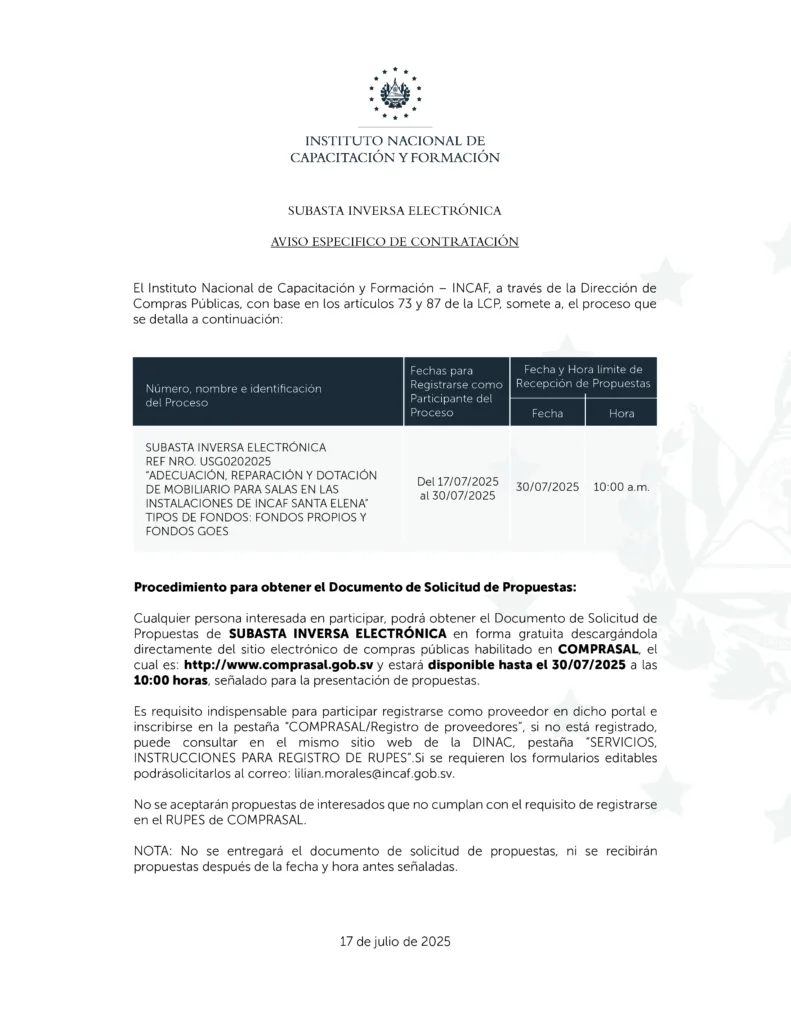 17/07/2025 No. USG0202025 “Adecuación, reparación y dotación de mobiliario para salas en las instalaciones de INCAF Santa Elena”
