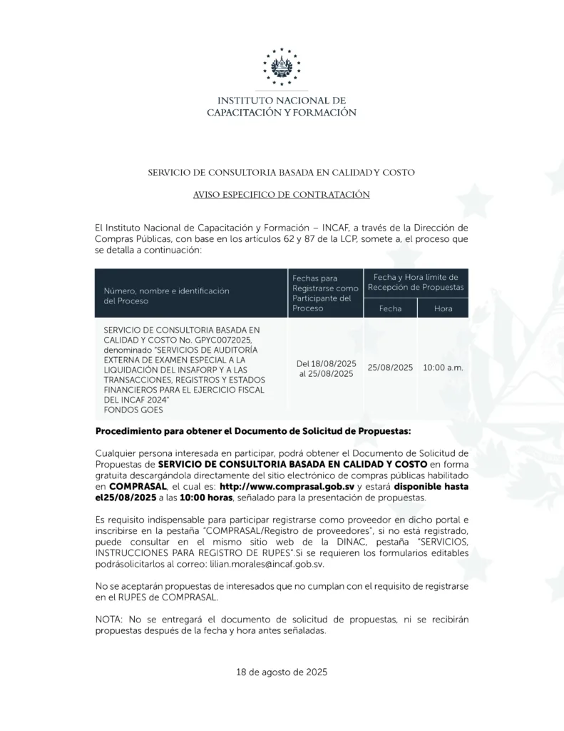 18/08/2025 No. GPYC0072025 “Servicios de auditoría externa de examen especial a la liquidación de INSAFORP y a las transacciones, registros y estados financieros para el ejercicio fiscal del INCAF 2024”
