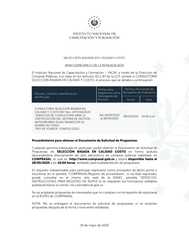 19/05/2025 No. GPYC0022025 “Servicios de consultoría para la certificación del Sistema de Gestión Antisoborno (SGAS) basado en la norma ISO 37001”