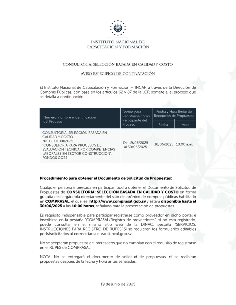 19/06/2025 No. GCDT0082025 “Consultoría para procesos de evaluación técnica por competencias laborales en sector construcción”