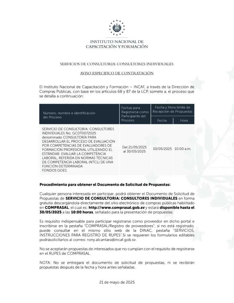 21/05/2025 No. GCDT0072025 “Consultoría para desarrollar el proceso de evaluación por competencias de evaluadores de formación profesional utilizando el estándar: Evaluar la competencia laboral, referida en normas técnicas de competencia laboral (NTCL) de una función determinada