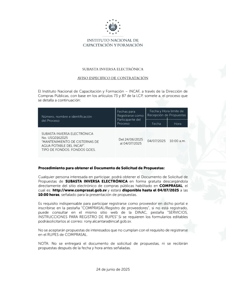 24/06/2025 No. USG0162025 “Mantenimiento de cisternas de agua potable del INCAF”