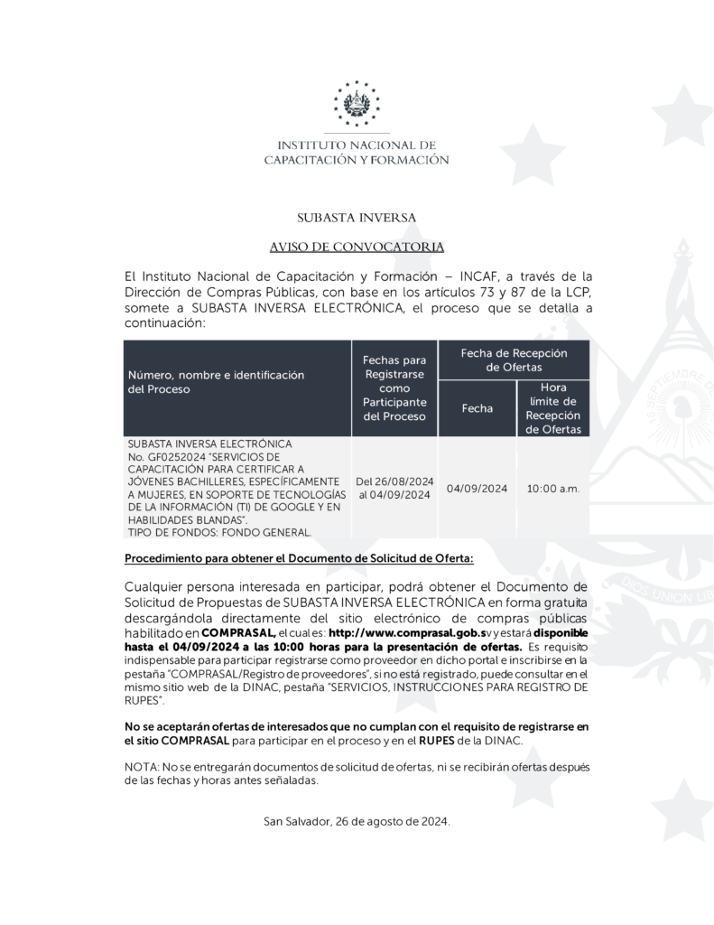 26/08/2024 No. GF0252024 “Servicios de capacitación para certificar a jóvenes bachilleres, específicamente a mujeres, en soporte de tecnologías de la información (TI) de Google y en Habilidades Blandas”.