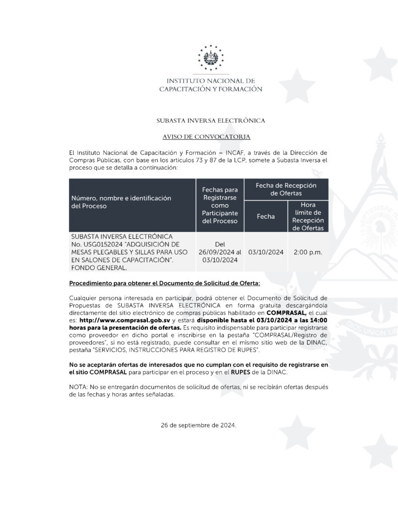 26/09/2024 No. USG0152024 “Adquisición de mesas plegables y sillas para uso en salones de capacitación”.