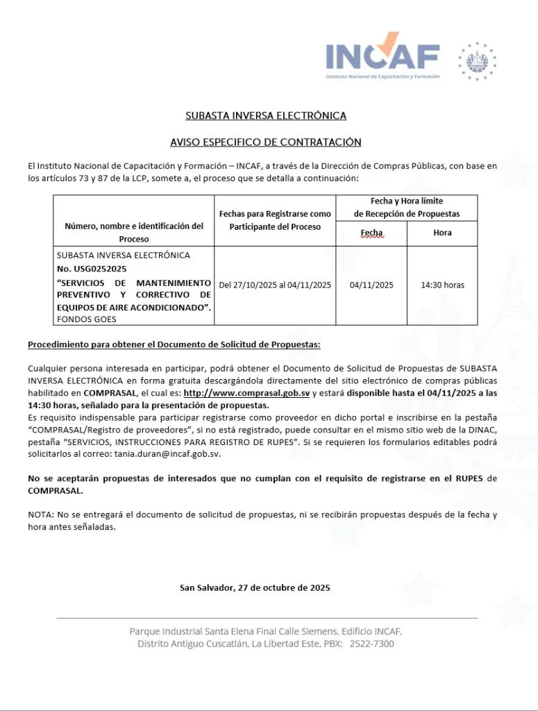 27/10/2025SUBASTA INVERSA ELECTRÓNICA No.USG0252025 “SERVICIOS DE MANTENIMIENTO PREVENTIVO Y CORRECTIVO DE EQUIPOS DE AIRE ACONDICIONADO”. FONDOS GOES